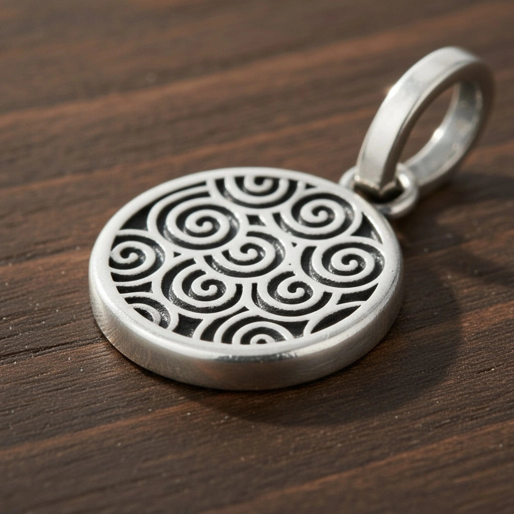 This elegant round pendant showcases a double-sided wave pattern, inspired by traditional Chinese “water and wind” motifs symbolizing smooth sailing, balance, and continuous good fortune. The wave design was widely used in ancient Chinese decorative arts, representing the harmony between movement and stillness. Crafted from solid 925 sterling silver, this pendant reflects both cultural heritage and refined craftsmanship — a meaningful charm for those who value peace, flow, and success in life.
